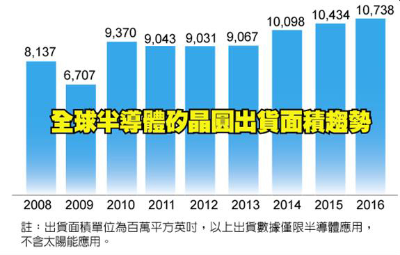 依據(jù)國際半導(dǎo)體產(chǎn)業(yè)協(xié)會(SEMI)旗下硅晶圓制造者部門SMG(Silicon Manufacturers Group)公布的年終硅晶圓產(chǎn)業(yè)分析報告顯示,2016年全球半導(dǎo)體硅晶圓出貨總面積達10,738百萬平方英吋,年成長率達3%,連續(xù)3年創(chuàng)下出貨量歷史記錄新高。