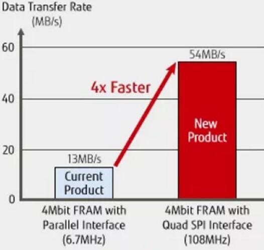 MB85RQ4ML采用Quad SPI接口,1.8V供電電壓,在108MHz工作頻率下數據傳輸速率可達54MB/s。在該產品發布之前,具有16個I/O引腳并行接口的4Mbit FRAM是最快的FRAM,具有13MB/s的數據傳輸速度。