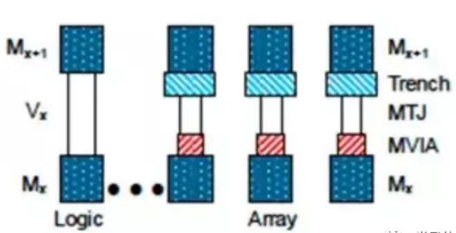 MRAM器件主要由兩個BEOL金屬層之間的磁性可編程電阻器實(shí)現(xiàn),如下列的圖2所顯示。