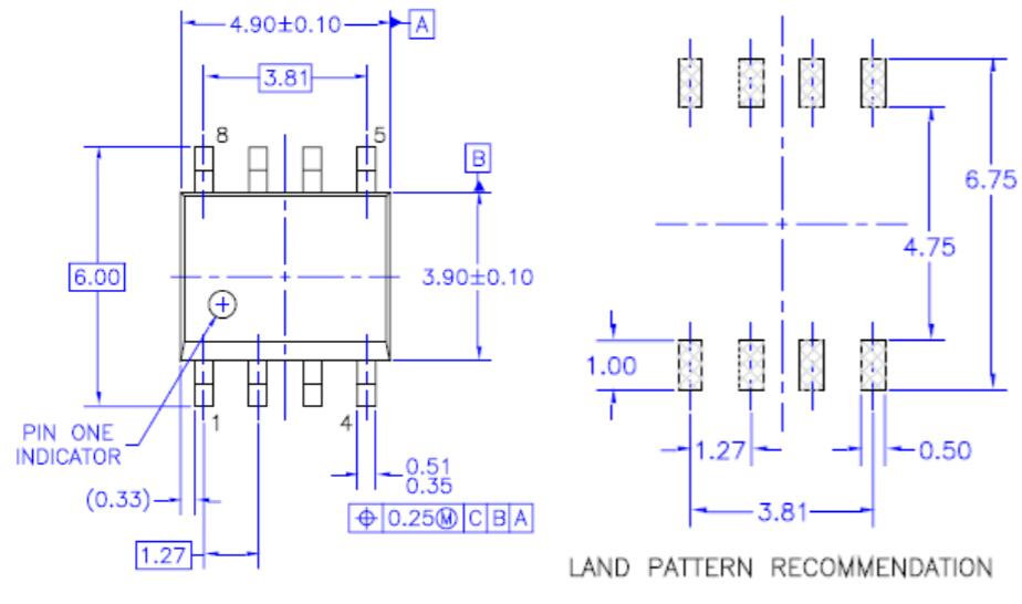 圖1代表了JEDEC標準SOIC-8封裝的近似尺寸和建議的PCB焊盤圖案(注意:以下尺寸為近似值,可能因供應商而異)