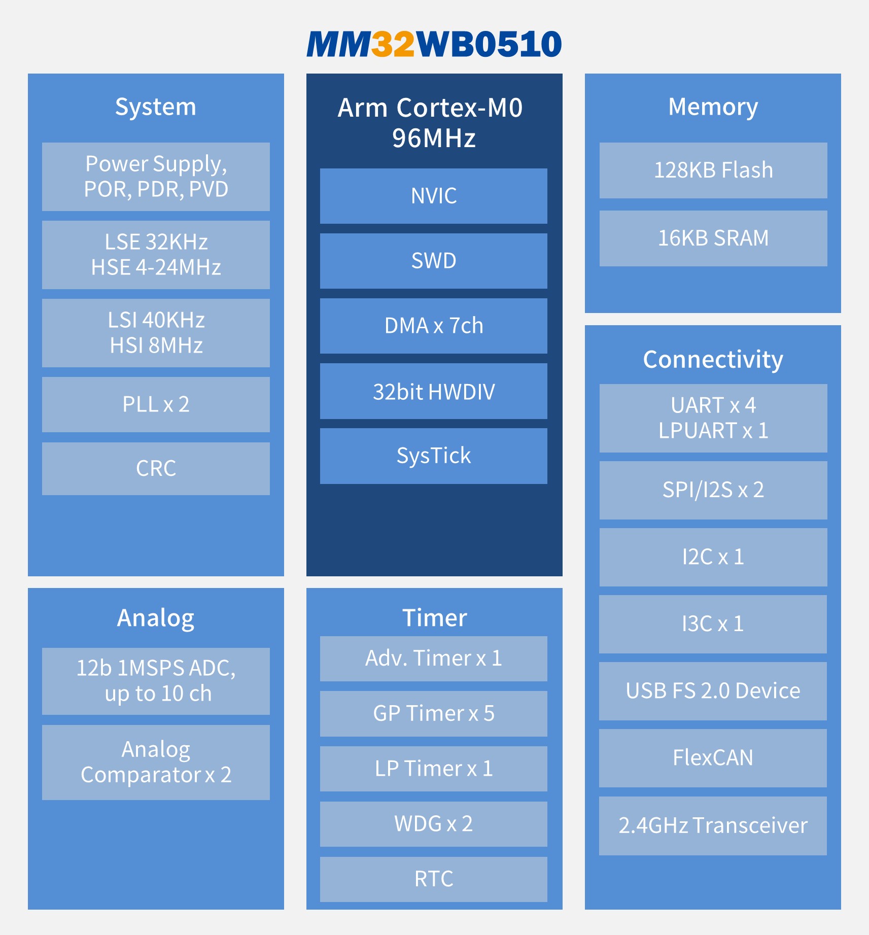 MM32WB0510搭載Arm Cortex-M0內(nèi)核,主頻可達(dá)96MHz,內(nèi)置128KB Flash和16KB SRAM,并集成了USB和FlexCAN接口,面向智能家居,鍵鼠,消防現(xiàn)場部件,電力電子,汽車OBU,汽車傳感器等無線和多接口類型的應(yīng)用。可選封裝形式包括:LQFP64,LQFP48,QFN48和QFN32。
