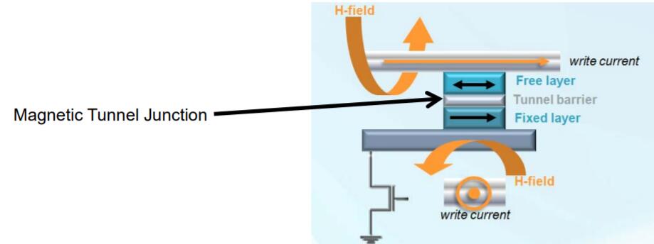 MRAM或磁性隨機存取存儲器使用1晶體管–1磁性隧道結(1T-1MTJ)架構,其中鐵磁材料的磁性“狀態(tài)”作為數(shù)據(jù)存儲元素。由于MRAM使用磁性狀態(tài)進行存儲(而不是隨時間推移而“泄漏”的電荷),因此